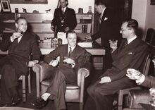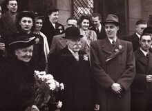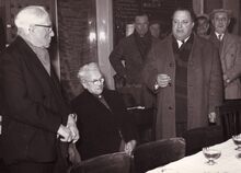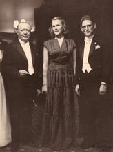 Burgemeester Adolf VAN GLABBEKE begroet een onbekende dame, met in het midden de heer Gilbert NATAN (eigenaar van de confectiezaak "A la Ville de Londres")
