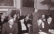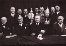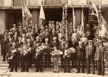 Enkele verenigingen uit Mariakerke werden ontvangen op het dd. stadhuis (huidig gerechtshof). Centraal vooraan Arthur VANHOUTTE,liberaal gemeenteraadslid en voorzitter Velo Club Wielersport Boxegem.