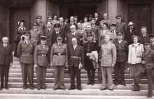 Burgemeester Henri SERRUYS met een groep geallieerde (medische) reserve officieren op de trappen van het dd.stadhuis (huidig gerechtshof) na ontvangst aldaar.
