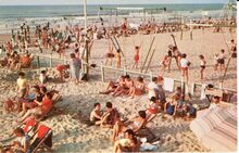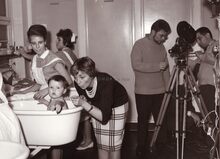 De Belgische zangeres Annie Cordy op bezoek in het Zeepreventorium van De Haan. Met grote media belangstelling.