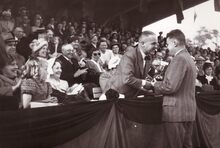 Burgemeester Adolf VAN GLABBEKE feliciteert een onbekende in de wielerbaan, zijn echtgenote zit bij hem. Centraal achter de burgemeester Arthur VANHOUTTE (met bril).