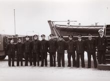 Een ploeg (bemanning ?) personeelsleden van het loodswezen op de kaai bij een sloep.Om zijn kleine gestalte te compenseren staat de kapitein (of schipper) op een verhoogje.