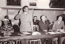 Een nieuw liberaal gemeenteraadsled legt de eed af .Links naast hem Henri DEGRAVE, dan Jan PIERS en Marie Jozef PORTA. Rechts vooraan burgemeester Adolf VAN GLABBEKE en 2e van links vooraan Berthe TRATSAERT.