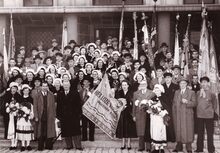 Het koor "Het Loze Vissertje" werd zopas ontvangen door het stadsbestuur.Hier poseren zij mét vlag "Het Loze Vissertje. Gemengd koor. Oostende" op de trappen van het stadshuis. Centraal naast de vlag schepen Emiel VROOME en dirigent Florimond CORSELLIS. Mevrouw A. LACOURT houdt de vlag in haar hand.