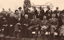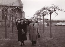 Burgemeester Adolf VAN GLABBEKE op de begraafplaats bij het Duinenkerkje, naast hem Berthe TRATSAERT (?),gemeenteraadslid en achter hem schepen Kamiel DEHOUCK. Rechts achteraan het grafmonument van Henri SERRUYS.