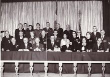 Een nieuw (liberaal ?) gemeenteraadslid wordt ingezworen.Vooraan links Berthe TRATSAERT enig vrouwelijk gemeenteraadslid. Uiterst rechts Willy SIX en Theo DEHAENE