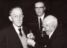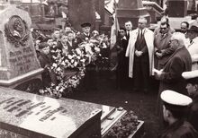 Jaarlijkse herdenking en bloemenhulde aan het graf van paster PYPE op het oud kerkhof aan Nieuwpoortsesteenweg, nu begraafplaats Paster Pype. We herkennen o.a. schepen Emiel VROOME. Hij was voorzitter van het "Herdenkingscomité Paster Pype", gesticht in 1962