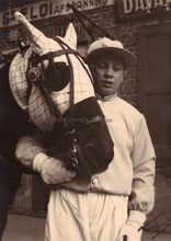 Jockey,kar en paard een reclame voor de Oostendse Revue,voor de afspanning St Eloi van Bertje BONTe aan de Hoge Barriere op de Torhoutse steenweg.