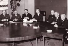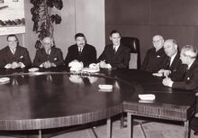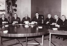 Het Oostends schepencollege in vergadering. Van links naar rechts Raymond MIROIR, John LAUWEREINS, Henri EDEBAU, Jan PIERS ,Michel SURMONT,stadssecretariis, Kamiel DEHOUCK en François VAN CAILLIE.