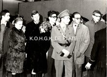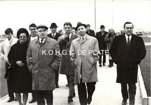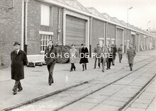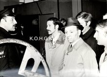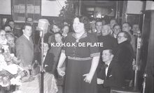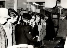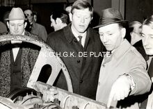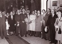 Formaat : 13 x 18 cm. - Plechtige opening van de nieuwe James Ensorgalerij. Rechts vooraan, Berthe Tratsaert, enige vrouw in de gemeenteraad. Vierde van rechts, John Hermans en naast hem gemeenteraadslid Marie-Jozef Porta en schepen François Van Caillie