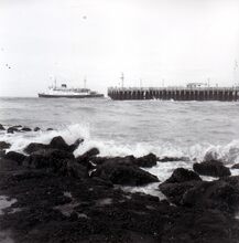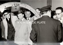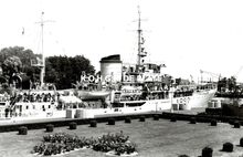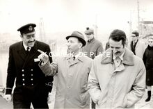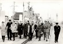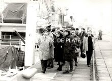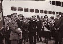 Verwelkoming van een groep britse oorlogs (?) invalieden aan de ferry te Oostende.Centraal staat commodore TIMMERMANS.een britse verpleegster (mevrouw HIRST ?) werd in de bloemetjes gezet.