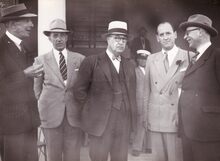 Burgemeester Henri SERRUYS (uiterst rechts) in gesprek met enkele personaliteiten op de Wellington renbaan.Op de achtergrond (met kepi) een personeelslid van de renbaan. Met witte hoed en bril Max DUGNIOLLE.