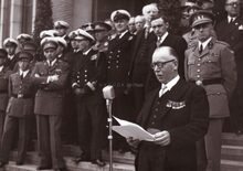 Formaat : 13 x 18 cm. - Burgemeester Henri Serruys houdt zijn toespraak op de trappen van het dd. stadhuis (huidig gerechtshof). Achter hem staat de gouverneur van West-Vlaanderen Pierre van Outryve d'Ydewalle en achter deze staat Michel Surmont, stadssecretaris. Derde links beneden, staat commodore Georges Timmermans, stafchef van de Zeemacht.