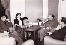 Hotel Osborne. De Franse actrice Danièle Delorme in een interview met Robert Lanoye, met notaboek op schoot, en John Hermans, journalist en gemeenteraadslid. Zij trad op in het toneelstuk "Colombe", een komedie in 4 bedrijven van Jean Anouilh, in de Koninklijke Schouwburg op 13/12/1953. Ingericht door "Casino-Kursaal d'Ostende - Galas Karsenty Parijs". Links, Yves Robert, acteur, scenarist...