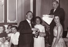 Tijdens een personeelsfeest huldigt de directie van de Innovation hun huisarchitect Vercauteren