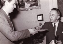 Jan Piers presenteert een koekje aan Emile Michaël, fotograaf en lid van de Brigade Piron