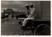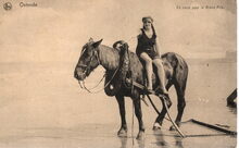 Formaat : 13 x 18 cm. - Genieten van de zon op een badkar. In de achtergrond het drde kursaal an andere badkarren getrokken door paarden