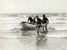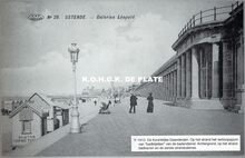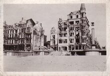 Zicht vanaf het groot strand op de vernielde gebouwenΒ op de Albert I-promenade en de badinstallaties met openbaar uurwerk