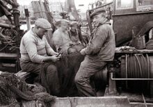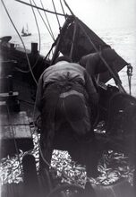 Foto z/w 18x13 + negatief. Op sprotvangst met de O.111 "Yvonne". De netten worden herstelt.
