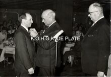 Formaat : 13Β x 18 cm.. - Louis Pincket, spelbediende, wordt gedecoreerd voorΒ 30 jaar arbeid door schepen Kamiel Dehouck. Roger DeΒ RamΓ©e, directeur van het Casino-Kursaal kijkt toe.