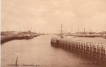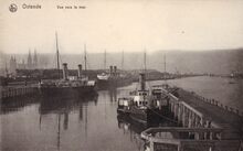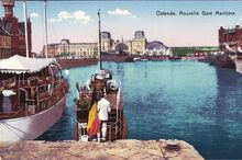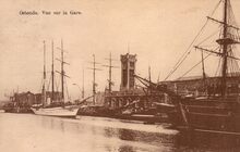 Nels. - Ostende - Gare Maritime. Oostende - Zeestation. - Vooraan, de Vindictivelaan en vissersvaartuigen gemeerd in het eerste handelsdok. Rechts, de toegang tot het afleidingskanaal. Links, de zeesluis die toegang gaf tot de haven. Het Zeestation en de nieuwe perrons. Het Zeestation had tijdens de Eerste Wereldoorlog grote schade. Druk verkeer aan de ingang van auto's en koetsiers en zie ook dat de tram tot aan het station reed. Op de achtergrond, de havengeul en de oude Vuurtorenwijk op de Oosteroever