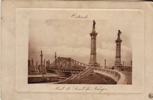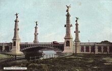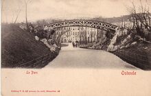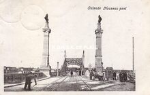 Le Bon, édit., Ostende, N°K29. - Ostende - Nouveaux Ponts. - De Graaf de Smet de Naeyerbruggen zijn een opeenvolging van drie bruggen in het verlengde van de Graaf de Smet de Naeyerlaan, als verbindingsbruggen tussen Blankenberge en Oostende, als onderdeel van de Koninklijke Baan. Aansluitend ook de draaibrug over de Demeysluis. Hier afgebeeld de tweede brug. Een grote brug in ronde boog van fraai gedecoreerd gietijzer met klinknagels over het nu verdwenen afleidingskanaal. Vier hoge natuurstenen brugpijlers met gebeeldhouwde versieringen van scheepsboegen, golven en schelpen, waarop bronzen naakte engelenbeelden van J. Dillens en K. De Kesel. Twee bronzen bas-reliëfs van K. De Kesel, eveneens met de scheepvaart als thema. De twee data, 1903 en 1905, verwijzen respectievelijk naar de eerstesteenlegging en de afwerking van de brug.