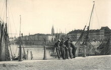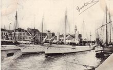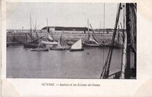Ostende. Le Bassin de Pêche. In het Schuildok, rechts, open garnaalboten of Oostendse schovers. Vooraan garnaalboten, type "schipje". O.15 "Zoë" van schipper-reder Edouard Verbiest en de O.41 "Persévérence" van schipper J. Vanderputte en reder wed. D. Vanderputte. Bron : Rapport sur l'administration et la situation des affaires de la Ville d'Ostende. 1898, p.157-158. Op de achtergrond, de oosteroever met links de tweede vuurtoren en ervoor het gebouw van de Quarantaine. Rechts de bewoning op de Vuurtorenwijk.