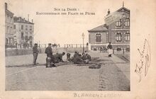 Sur la Digue : Raccommodage des Filets de Pêche. - Rechts, het gebouw van de Bestendige Reddingsdienst. Links het "Hôtel de L'Estacade".