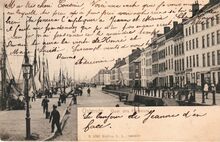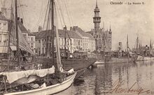 Postkaart : ND Phot, nr.191 (Neurdein). Ostende - Le Pont de la Rue de la Chapelle. De Kapellebrug richting Kapellestraat. De handelsdokken en de Keizerskaai. Met o.a. van links naar rechts : Hôtel de la Couronne, de Kapellestraat, Hôtel du Bassin, Hôtel Cosmopolite, kolenhandel Oscar Helsmoortel (Keizerskaai 10)
