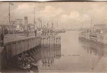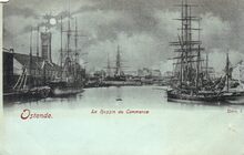 Ostende. Le Bassin du Commerce. We zien het eerste handelsdok met links het stapelhuis van de stad. Er achter het tweede spoorwegstation (Oostende-Station). De handelsdokken gelegen langs de Keizerskaai (Quai de l'Empereur). Uit erkentelijkheid aan de Oostenrijkse keizer Jozef II gaf men zijn naam aan de weg langs de eerste twee handelsdokken. Weg die ontstaan was na de ontmanteling van de zuidelijke vestingen in 1781. Tot eind septemver 1912 droegen alle straten en kaaien rondom de handelskommen deze naam. Bron : Straatnamen van A tot Z / Daniel Deschacht. 1998, p.83. Plate BIB B235. Op de achtergrond de huizenrij van de Stockholmstraat, gelegen aan het derde handelsdok, waar veel scheepswerven zich bevonden.
