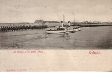 Le Bon, édit, Ostende, N° K21. - Ostende - Estacades. - Het wit vaartuig is het Koninklijk Jacht Alberta. - Aan de kaaien aangemeerd, pakketboten van de Oostende - Dover lijn. Links, het eerste zeestation, het nieuwe moet nog gebouwd worden