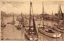 Ostende - Le Bassin II. - Vissersvaartuigen aangemeerd in het eerste handelsdok langs de Keizerskaai. O.a. op het einde links, de O.82 "Gaby" van de rederij s.a. Pêcherie à Vapeur (John Bauwens) en nabij, het Zeevaartcommissariaat, in de volksmond "Pilotage" genaamd. - De rederij was gevestigd op nr. 5 en na de Eerste Wereldoorlog, toen Keizerskaai veranderde in Vindictivelaan waren daar ook de kantoren van de Froid Industriel. Vanaf 1934 op de Rederijkaai, vanaf 1951, Hendrik Baelskaai. Ook de O.78 "Belgica" van de rederij Hessens en Willems is aangemeerd. De schouw volledig zwart, onderbroken door een witte band met de Belgische vlag.