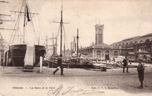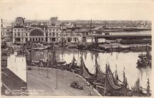 Postkaart : Edit; O.V.S. Bruxelles. Ostende - La Gare et le Port. Het tweede spoorwegstation (1882) gelegen aan de Keizerskaai, vanaf 1912 Stationskaai, nu Leopold III-laan, aan de zuidkant van het tweede handelsdok.