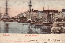 Editeur J.H. Schaefer, Amsterdam, Déposé, O.52. - Ostende - Quai des Pêcheurs. - Bijgekleurde kaart. - Zicht op het eerste handelsdok gelegen langs de Keizerskaai. Het gebouw met het torentje is de "Pilotage" of het Zeevaartcommissariaat.