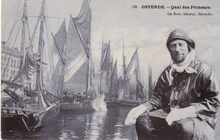 Ostende. Des barques des pêcheurs. Vooraan, eenmansgarnaalboten. Op de achtergrond, links, het gebouw van de reddingsdienst, in de volksmond "De Permerensje". Links de Visserskaai