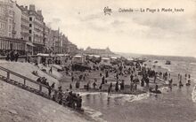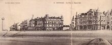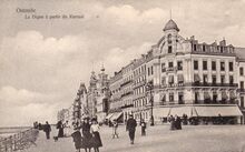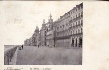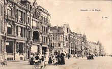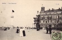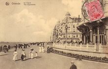 Ostende. La Digue. Premier Grand Hotel des Bains, gelegen op de Zeedijk, hoek Louisastraat. Let op de modieus geklede vrouwen, met zonnescherm, en mannen.