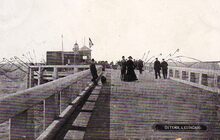 [Neurdein], ND Phot., zonder nummer. - Ostende - L'Estacade. - Het einde van het Weststaketsel, in Oostende "'t koptje van 't hoofd". Je kon in het paviljoentje genieten van een drankje en ook gezonde zeelucht. De toerist kon met een kruisnet, een krabbetje of visje, proberen te verschalken. Oostende in de periode rond 1900.