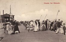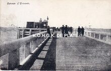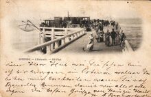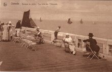 Ostende - L'Estacade. - Het einde van het Weststaketsel, of "'t koptje van 't hoofd", waar je in het café-paviljoen kon genieten van een drankje en de gezonde zeelucht. Populair was ook, met een kruisnet een krabbetje of visje te vangen. Een wandeling op het staketsel was populair bij de toerist en de Oostendenaar. Oostende tijdens de Belle Epoque, waar de dames zich met een parasol beschermden tegen de zon. Een bruine huid was toen niet in de mode.