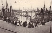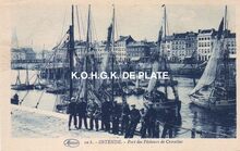 Nels serie Ostende nr 56. Ostende. Quai des Pêcheurs. Vissersvrouwen en kinderen aan de kaai van het Schuildok. Garnaalboten aangemeerd met o.a. Oostendse schovers. Aan de kaai van de haven, een stoomrader pakketboot.