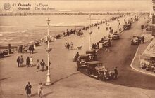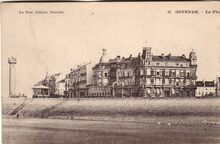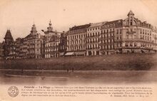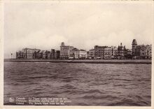 Ostende - La Plage. - De Zeedijk ten oosten van het Kursaal gezien vanaf het Groot Strand. Op de hoek met de Kursaal-Oosthelling, het Hotel Royal Belge.