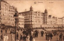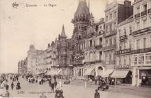 Ostende - La Digue Centrale. - De Zeedijk ten oosten van het Kursaal. Op de hoek met de Kursaal-Oosthelling, het Hotel Royal Belge.