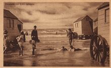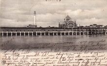 Ostende - Bains des Estacades. Carte Lux nr 38. Rechts het gebouw van de reddingsdienst, in de volksmond "De Permerensje". Links op de oosteroever de tweede vuurtoren en in het midden het gebouw van de "Quarantaine". In dit gebouw werden goederen en brieven die kwamen uit landen waar eventuele besmettelijke ziekten heersten, gedesinfecteerd. Na de Eerste Wereldoorlog geraakte het gebouw in verval en werd dan gesloopt. Vooraan op het strand de typische badkarren