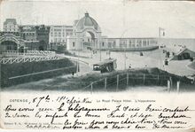 Ostende. La Digue de Mer et l'Entrée du Kursaal. De Zeedijk gezien richting havengeul. Rechts het Casino-Kursaal en het "Hôtel Royal Belge".