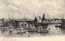 Le Bon, éditeur, Ostende, nr. 216. - Ostende. Bateaux de pêche. - In het midden, open garnaalboten of Oostendse schovers. Links, de Visserskaai. Aangemeerd, een panneschuit, de P.14 "Marie Thérèse".
