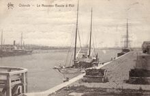 Ostende. Le nouveau Bassin. De havengeul met zicht op de oosteroever en de werkhuizen van het Zeewezen. Aangemeerd de pakketboten van het Zeewezen en het jacht "Alberta" van koning Leopold II