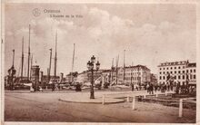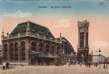 Ostende. La Gare Centrale. Met zicht op de Vandersweepplaats op de wijk Hazegras. Sedert 1888, de vroegere benaming was Place Neuve. François Van Der Sweep, ingenieur, voorzitter raad van bestuur van de Belgische spoorwegen. Als hoofdingenieur stond hij in voor de ontmantelingswerken (1865-1875) te Oostende. Geboren te Oostende (Jozef II-straat) op 25 maart 1821 en overleden te Elsene op 2 mei 1884. Bron : Straatnamen van Oostende van A tot Z / Daniel Deschacht. 1982, p.163. Plate BIB B235