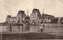 Ostende - Vers l'Estacade. Links de eerste vuurtoren, in de volksmond, de "vlaggestok" genoemd. Gebouwd in 1771 en in gebruik tot 1859. Op deze plaats staat nu het Monument der Zeelieden (Zeeheldenplein). Uiterst links, op de oosteroever de tweede vuurtoren. Rechts, het hotel "Royal Phare Hotel"