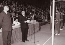 Waarnemend burgemeester John LAUWEREINS opent het Europees volleybal tornooi in het sportcentrum in de koninklijke stallingen. Achter de tafel rechts, Roger COENYE, volleybal scheidsrechter, en bediende bij de stedelijke werkhuizen. Het tornooi werd gewonnen door Nederland, tweede België en derde Italië.