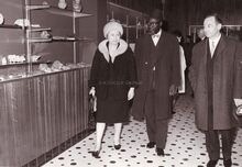 Mevrouw John LAUWEREINS leidt enkele gasten rond, o.a. de ambassadeur van Senegal, tijdens de inhuldiging van de Stedelijke Visserijschool John BAUWENS. Op de achtergrond kijkt stadssecretaris Michel SURMONT toe.