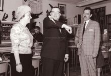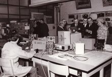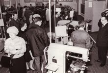 Schepen John LAUWEREINS, uiterst rechts en mevrouw links vooraan bekijken de machines in de Stedelijke Visserijschool John BAUWENS. Achter mevrouw LAUWEREINS staat Alfons GOES, kantonaal inspecteur Lager Onderwijs. Inhuldiging van de school.